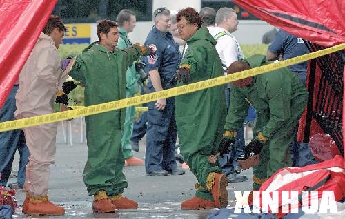 在美國佛羅里達州的杰克遜維爾市,從發生爆炸的尤尼森工業公司走出的救援人員接受輻射檢查